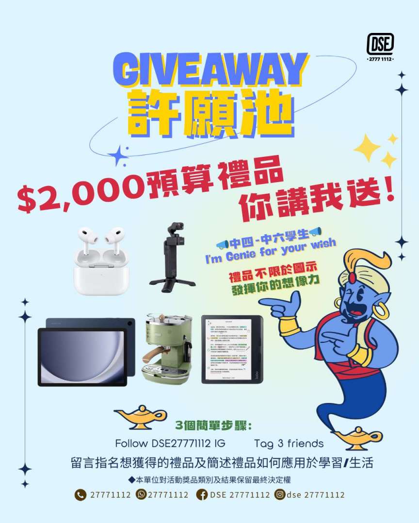 由備試考DSE到派成績,辛苦咗咁耐,終於可以鬆一口氣啦!🎉希望大家搵到屬於自己嘅方向!為鼓勵你哋繼續喺學業、職涯上奮鬥,我哋準備咗DSE Giveaway許願池,參加許願活動即有機會獲得最高價值$2,000嘅禮品!🎁