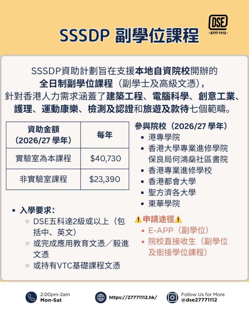 • SSSDP資助計劃旨在支援本地自資院校開辦的全日制副學位課程,如副學士及高級文憑,針對香港人力需求涵蓋了建築及工程電腦科學創意工業護理運動康樂檢測及認證旅遊及款待七個範疇。​