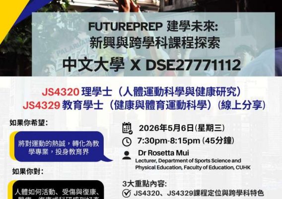 在社會日益關注健康、身心發展及學習素質的背景下,體育運動科學已成為具發展前景的學習方向。香港中文大學教育學院轄下的體育運動科學系(SSPE),結合運動科學、健康研究與教育專業,致力培育具備科學素養、教學能力及專業視野的人才。課程強調理論與實踐並重,涵蓋人體運動、健康促進、體育教育及學生成長等核心範疇,讓學生在掌握運動與健康科學知識之餘,亦能理解教育現場的實際需要,回應社會對健康教育與體育專業人才的殷切需求。